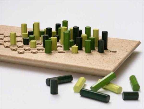 Die Steine gibt es in drei Längen, die unterschiedliche Farben haben. Sie sollen Bäume in einer Baumschule darstellen, die immer wieder umgepflanzt werden. Beide Spieler haben den gleichen Satz. Es spielt keine Rolle, wer einen Stein gesetzt hat. Doch das Ziel der Spieler ist unterschiedlich. Einer will zusammenhängende Flächen in drei Höhen, der andere in drei Farben erreichen. Das erweist sich als knifflig. Und spannend!