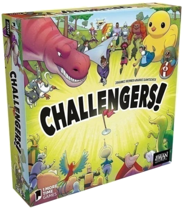Challengers von Johannes Krenner & Markus Slawitscheck bei Z-Man/1 More Time Games, Vertrieb Asmodee, Grafik von Jeff Harvey, 1 bis 8 Spieler ab 8 Jahren, ca. 45 Minuten, ca. 35€