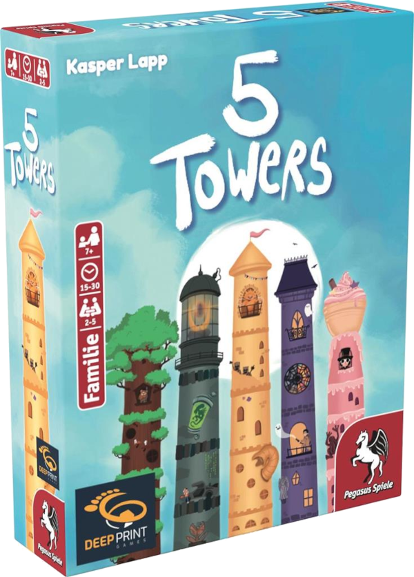 5 Towers von Kaspar Lapp, Artwork: Annika Heller, DeepPrint Games, Vertrieb Pegasus, 2 bis 5 Spieler (je mehr, desto besser!), ab 7 J., ca. 15 bis 30 Min., ca. 10 €, deep-print-games.com, pegasus.de
