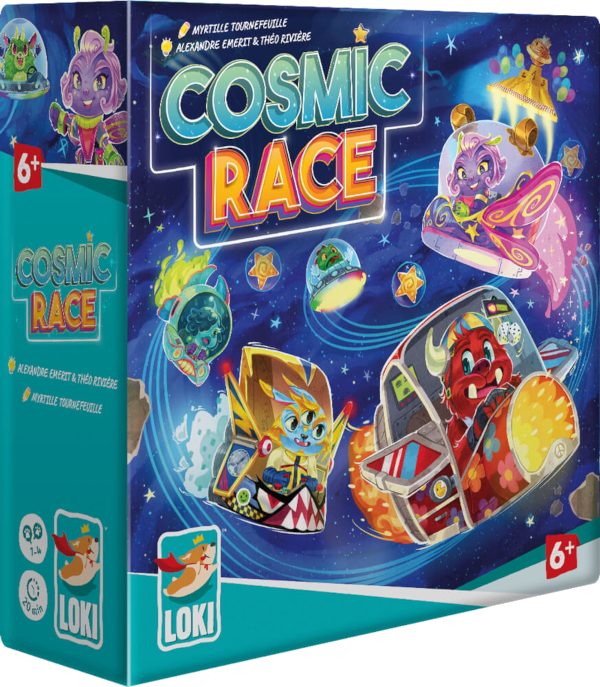 Cosmic Race von Alexandre Emerit und Théo Rivière bei Loki, Vertrieb Huch, Grafik von Myrtille Tournefeuille, 1 bis 4 Spieler ab 6 Jahren, ca. 20 Minuten, ca. 27 Euro